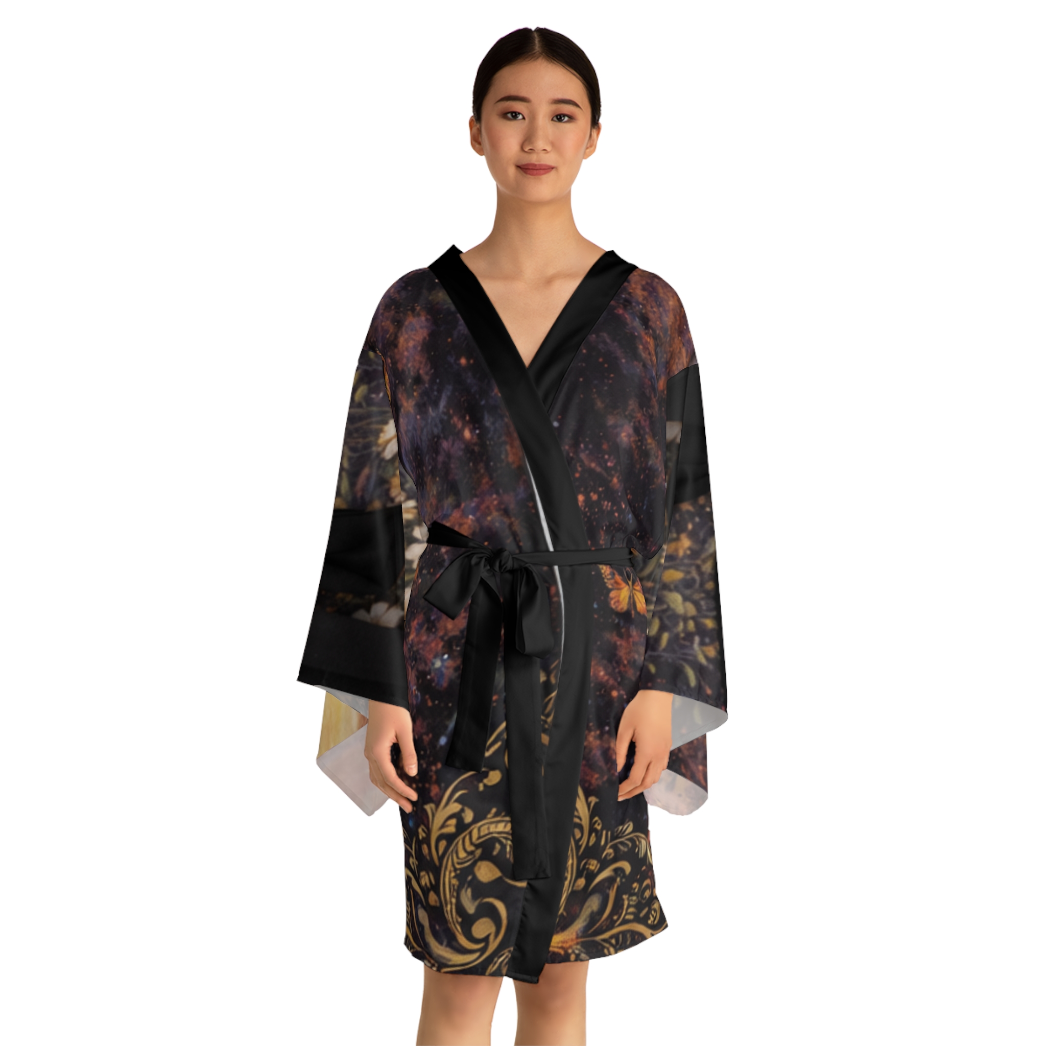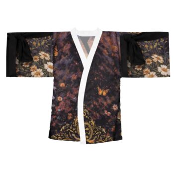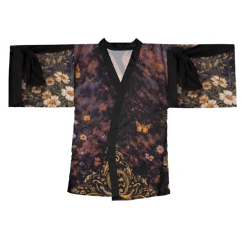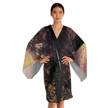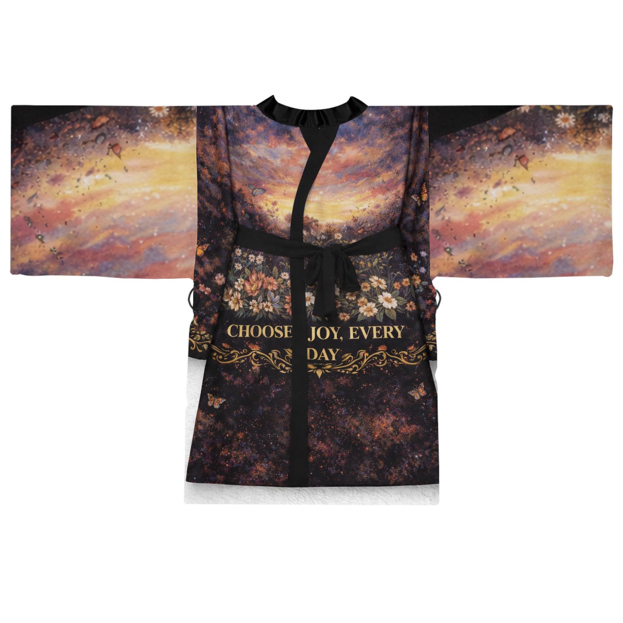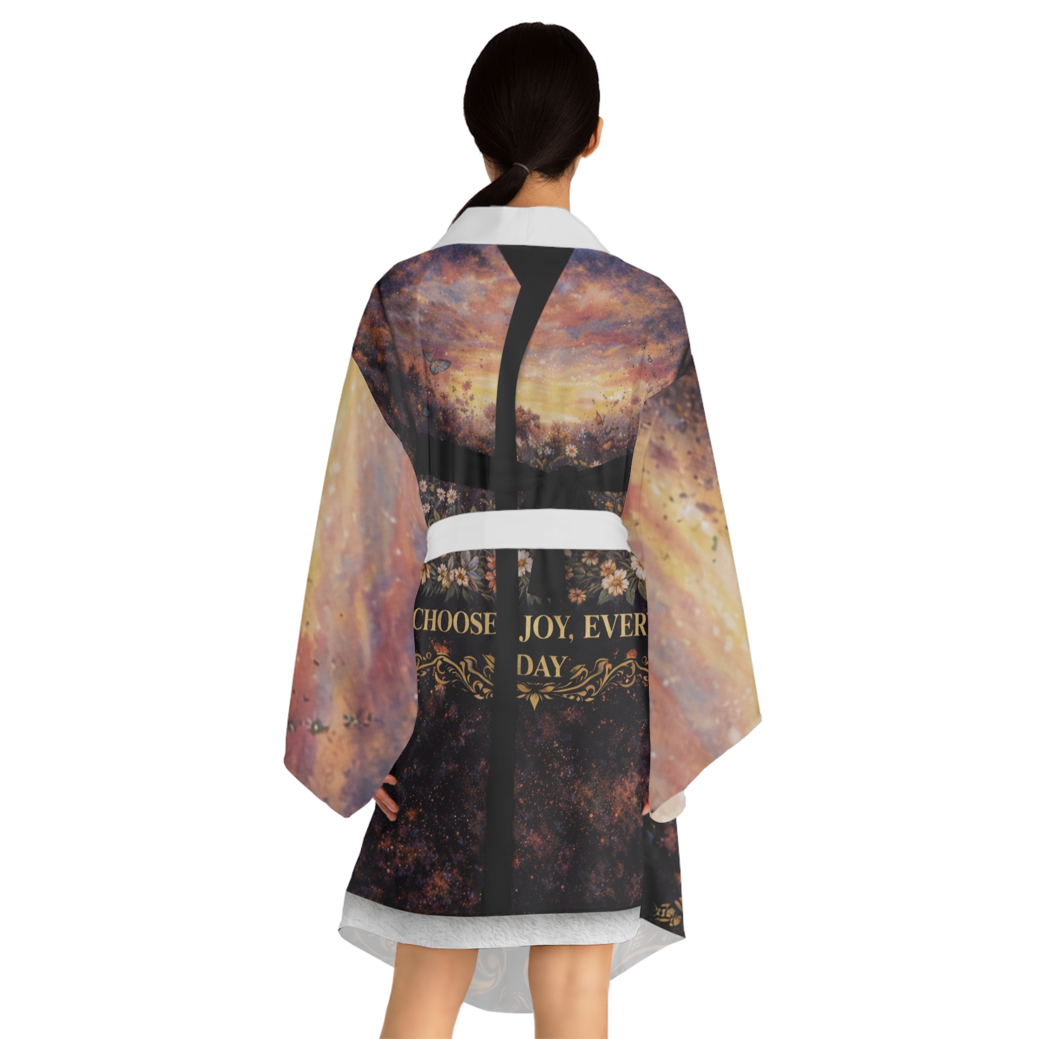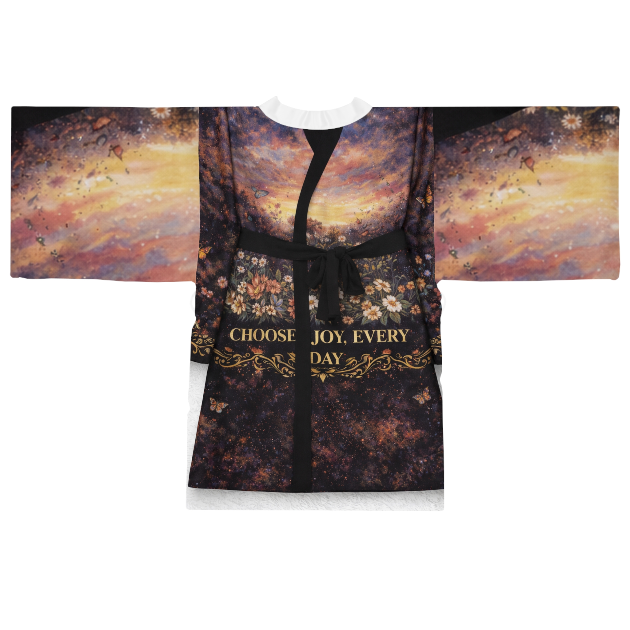 This mid-length kimono robe drapes like a quiet promise: lightweight polyester with a smooth hand that moves as you do. The design blends painterly skies, vintage florals and a warm, gilded script that reads like a daily reminder — gentle, hopeful, and just a little mysterious. Wear it over loungewear for slow mornings or style it as an evening wrap when you want something flowy and flattering. The kimono’s wide bell sleeves and belted waist create a graceful silhouette while the light fabric keeps it airy and easy to layer. Subtle contrasts at the front edge and belt keep the attention on the print, so the robe reads like wearable art rather than just clothing.