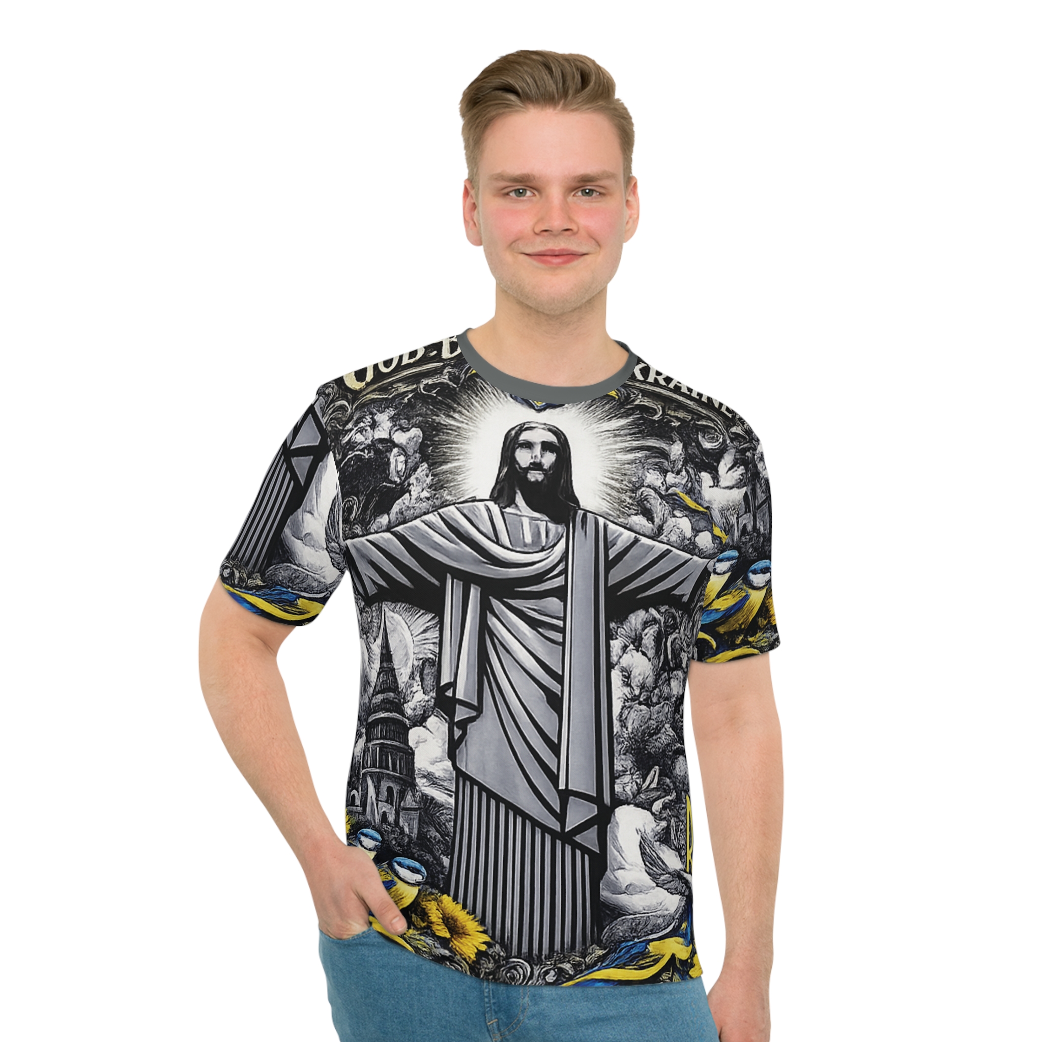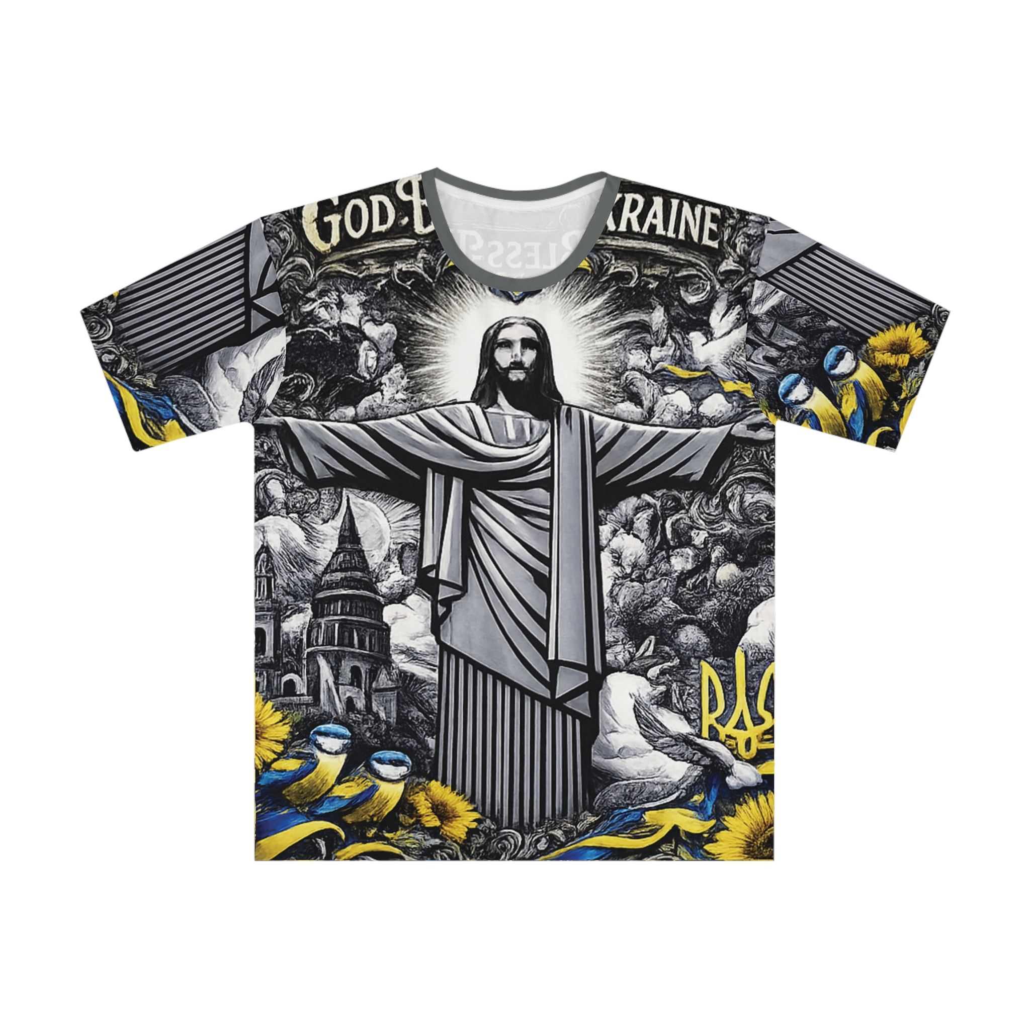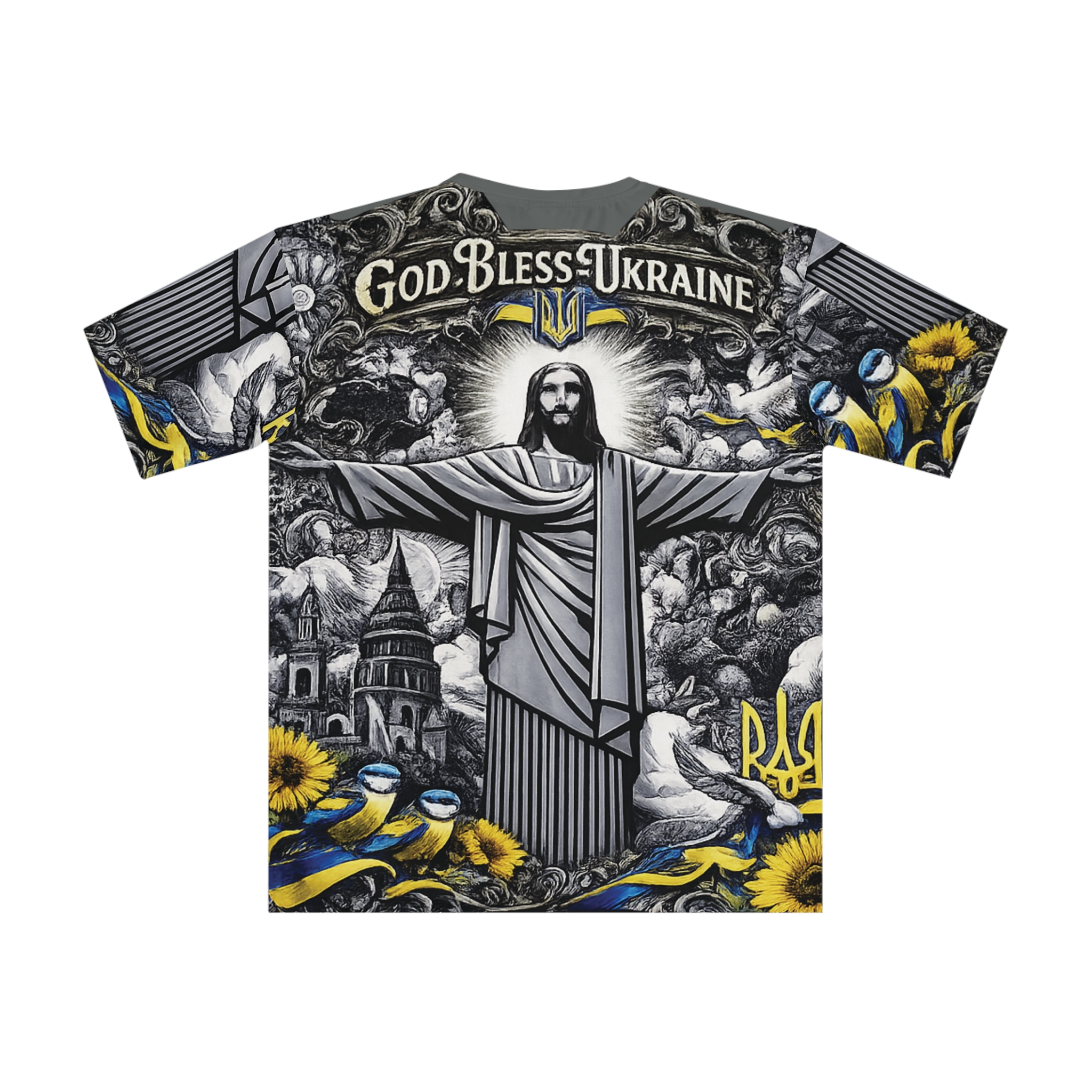 This loose-fit all-over print tee carries a heartfelt tribute to Ukraine with bold iconography and thoughtful detail. The front and back feature a striking monochrome illustration of a robed, open-armed figure beneath a glowing halo, framed by swirling clouds, city silhouettes and symbolic elements in blue and yellow — sunflowers, ribbons, and small tridents — that speak to resilience and national pride. The fabric drapes lightly and moves with you, making this shirt a wearable statement that blends comfort with a strong visual message. Wear it layered with a jacket or alone on warm days; it reads like a personal banner — quiet faith, steadfast solidarity.