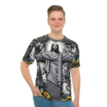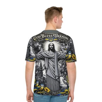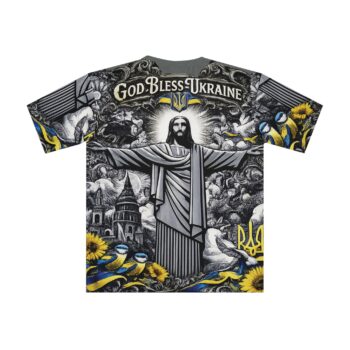 The God Bless Ukraine Graphic T-Shirt combines spiritual symbolism with patriotic expression. It delivers a message of hope while maintaining modern style. As a result, this all-over print tee stands out with both purpose and presence.