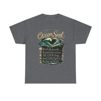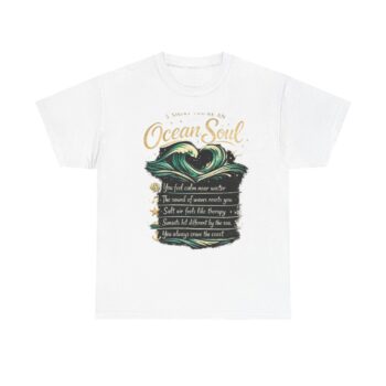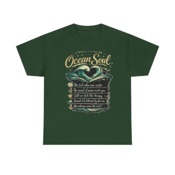 Ocean Soul tee — a soft, sturdy classic that feels like salt air on your skin. The artwork folds a crashing emerald wave and hand-lettered lines into a calm, carried-away moment: an ode to people who live by tides and long walks along the shore. Wear it to slow mornings with coffee and sea breeze, to bonfires where conversations drift like gulls, or on ferry rides that leave footprints on sand. The relaxed crew cut sits easy over sweaters or alone on warm days; the slightly textured natural fabric and crisp print give the design a worn-in, personal look that reads like a memory rather than an advertisement. Lightweight but durable, this shirt keeps its shape and the print stays vivid wash after wash — just the kind of dependable piece ocean lovers reach for again and again.