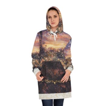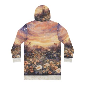 Slide into a soft, wearable painting — this hoodie dress wraps you in late-summer dusk and a field of wildflowers. The all-over print blends buttery sunset tones with delicate daisies and vintage accents for a look that feels wistful and quietly bold. The roomy kangaroo pocket and adjustable hood make it a cozy layer for slow mornings, twilight walks, or lingering at a café with a sketchbook. The subtle sheen of the fabric lets the colors glow without shouting, so the dress reads like personal armor for anyone who loves gentle, artful style and comfort that travels from city streets to country lanes.