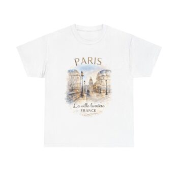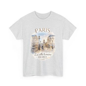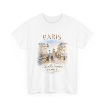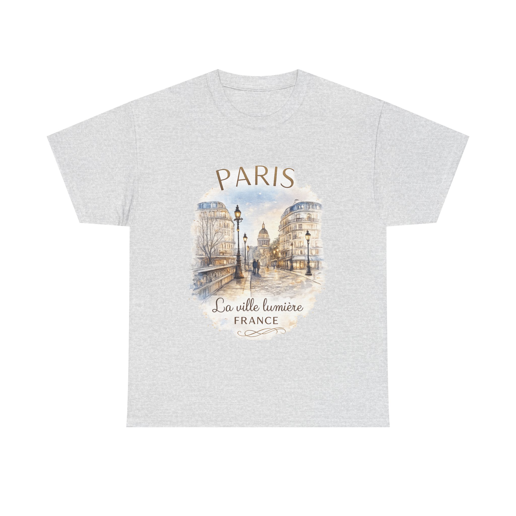 Soft cotton, a sketchbook of Paris across your chest. This tee carries a gentle watercolor of cobblestone streets, gas lamps and the distant silhouette of a dome — a quiet nod to La Ville Lumière. It sits easily in the wardrobe: breathable, lived-in, and calm. Wear it on slow mornings with coffee and a map, on museum afternoons watching sunlight spill over stone, or tucked under a cardigan for evening strolls by riverlight. The artwork speaks to wanderers who collect moments, not souvenirs. Subtle colors and a vintage-faded look make the design feel like a found postcard, honest and personal.