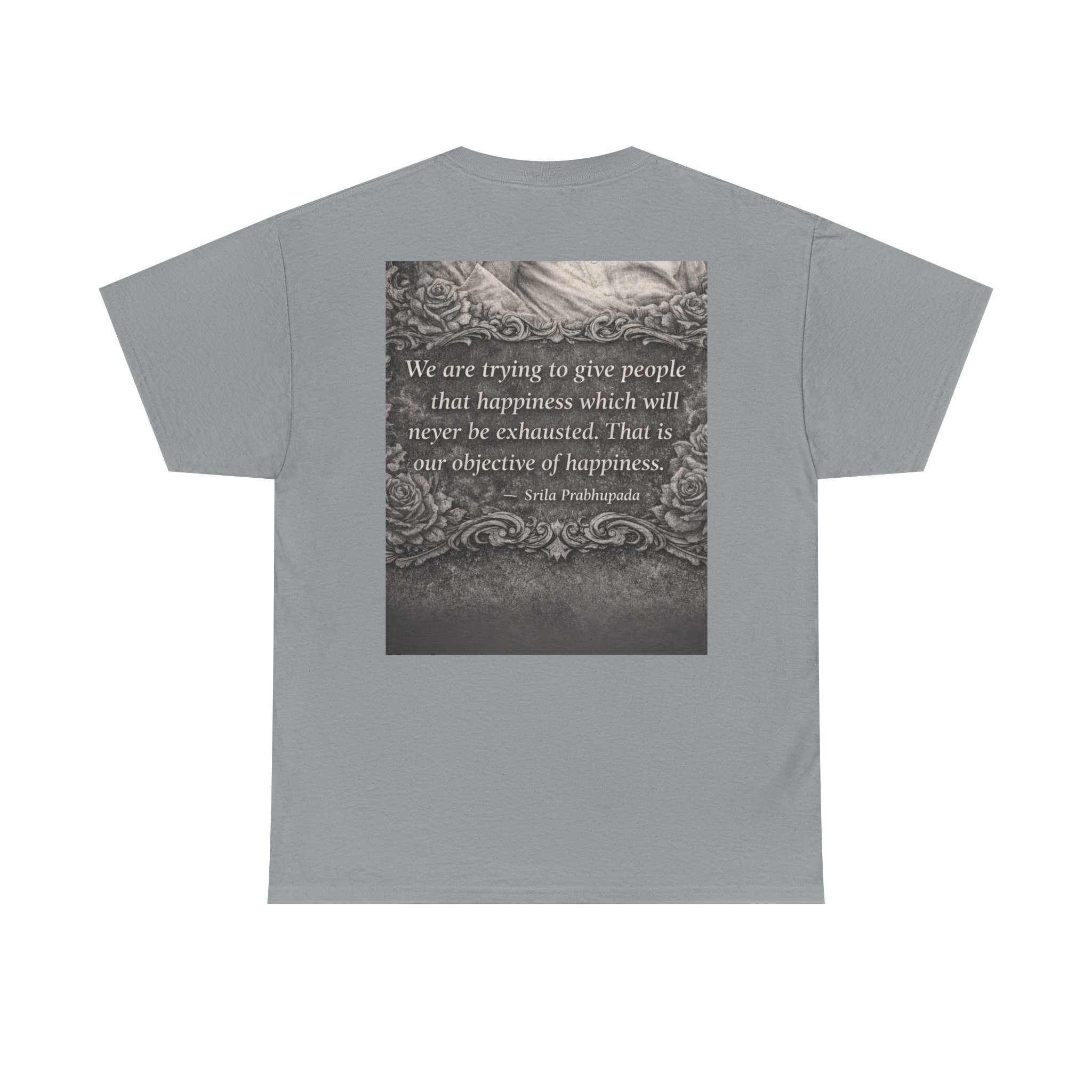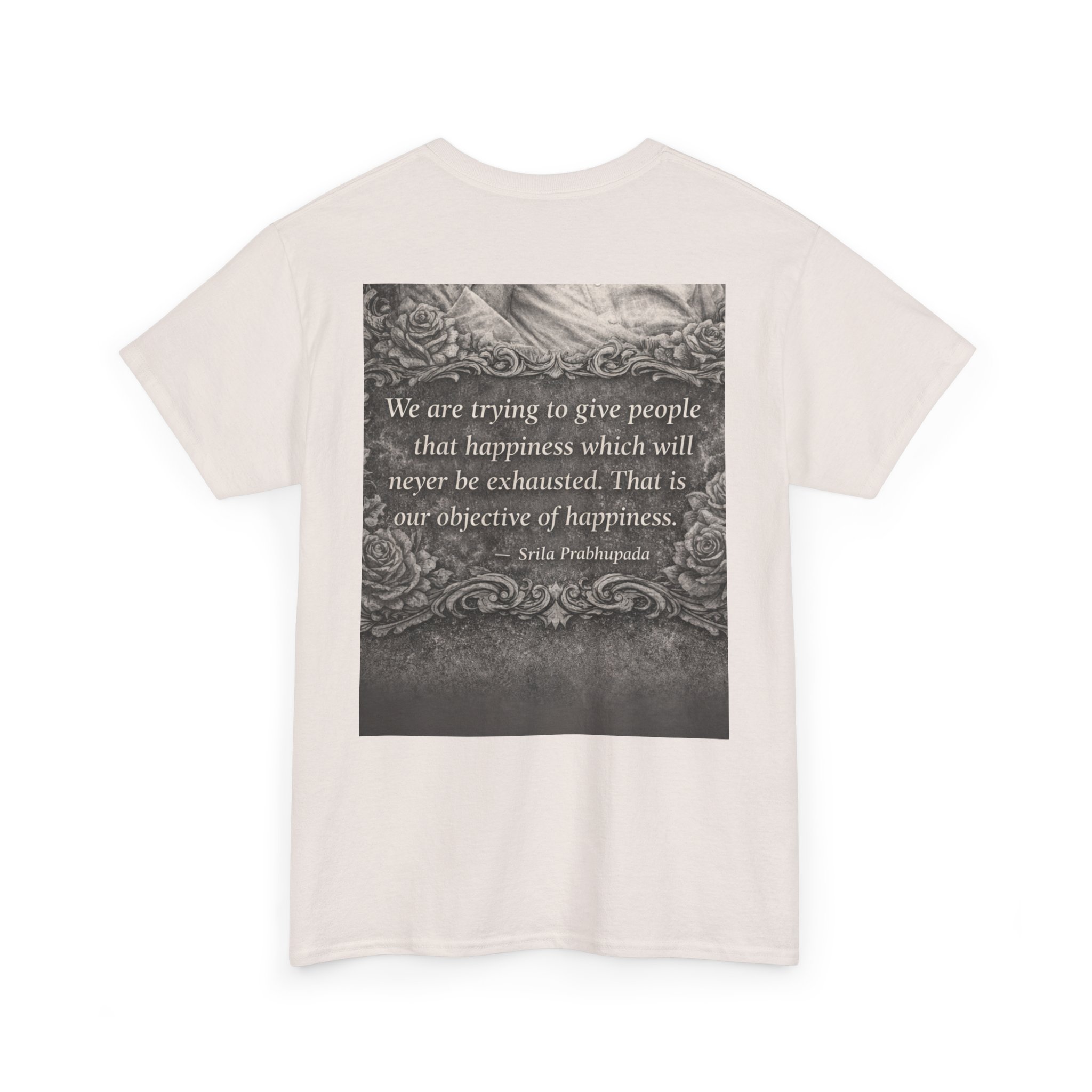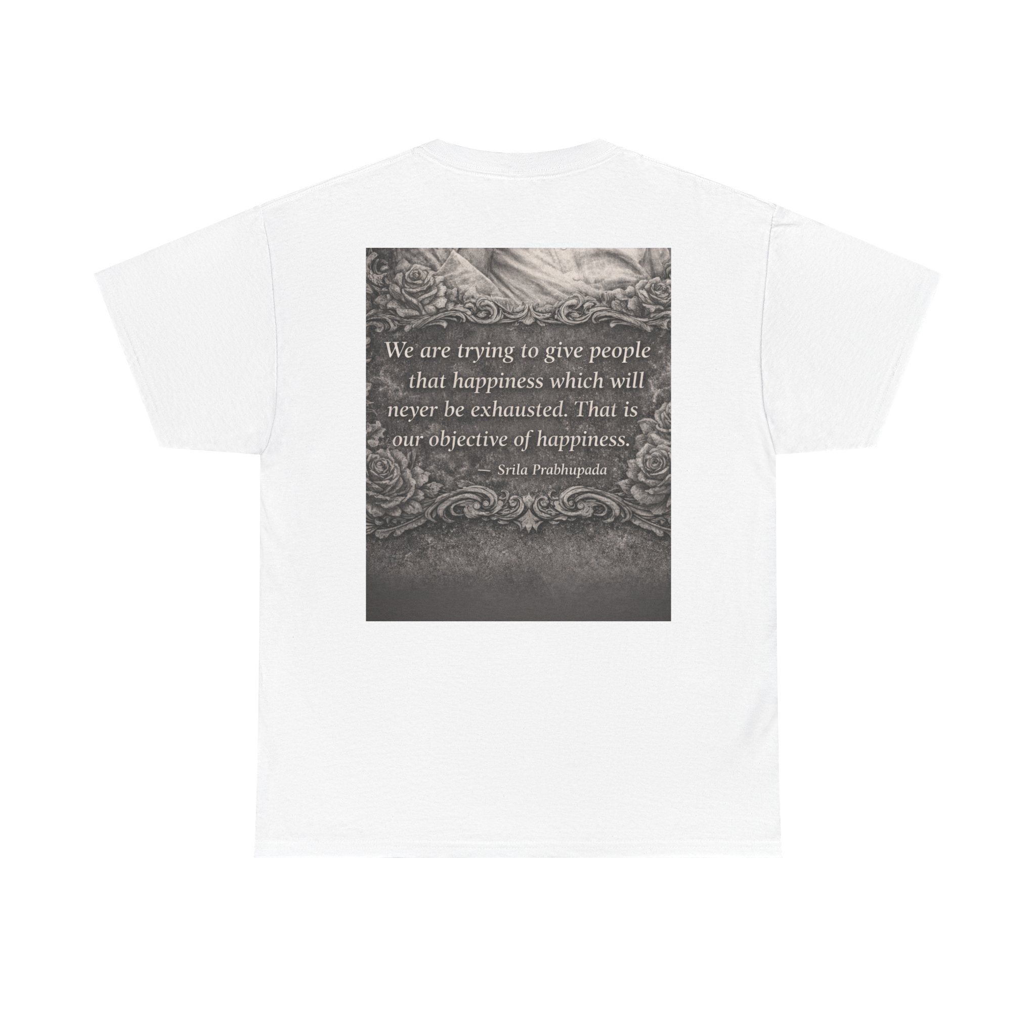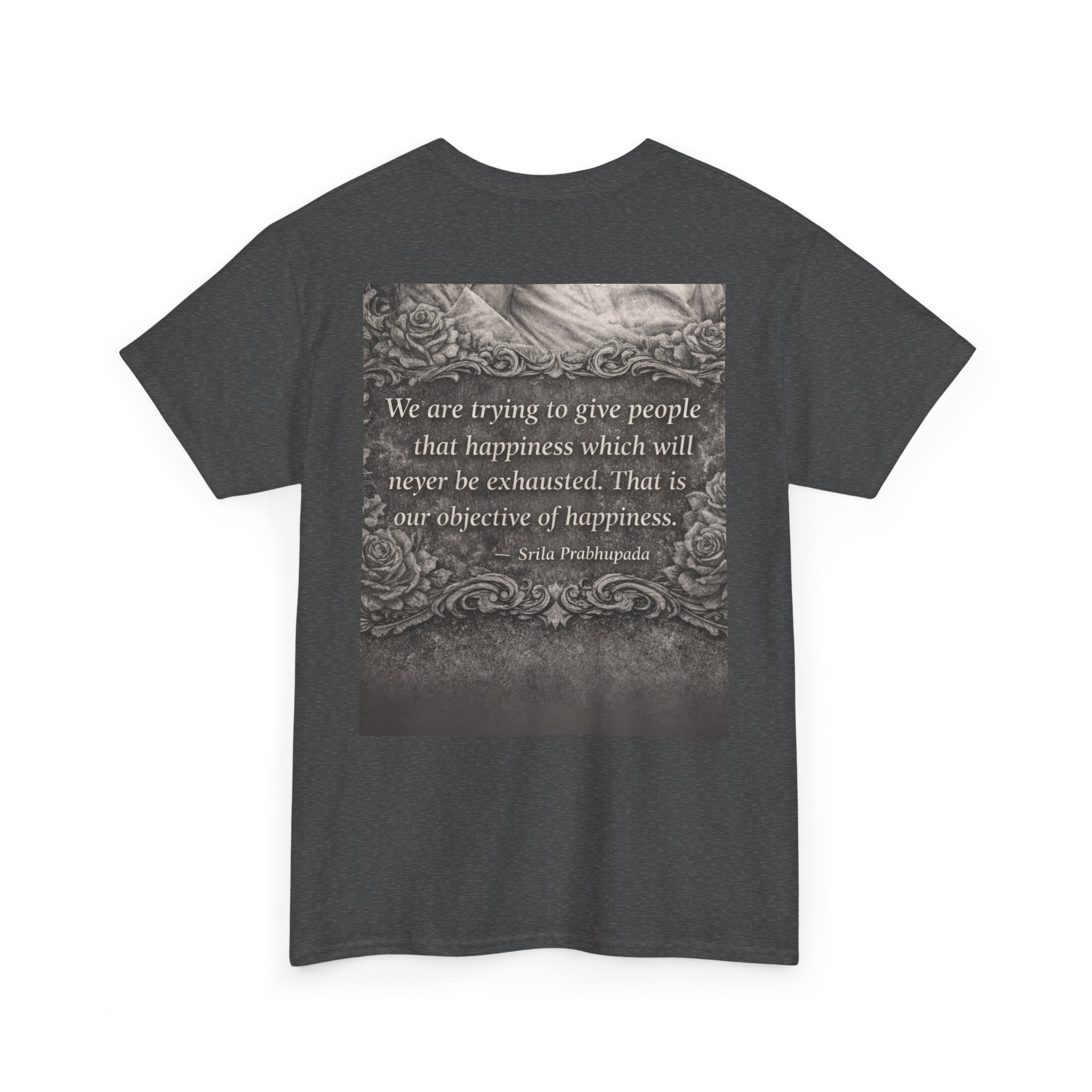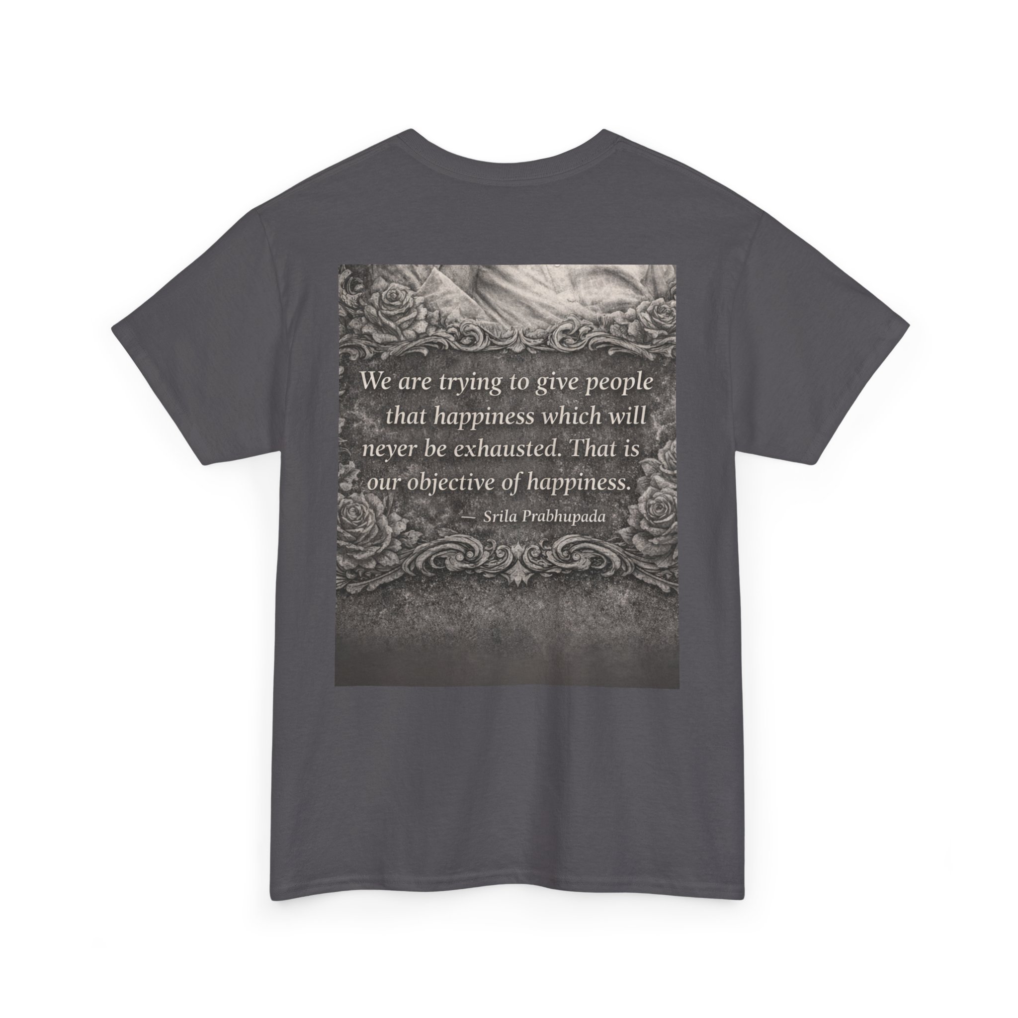 Spiritual Guru Prabhupada Portrait Tee — “Our Objective of Happiness” Inspirational T-Shirt