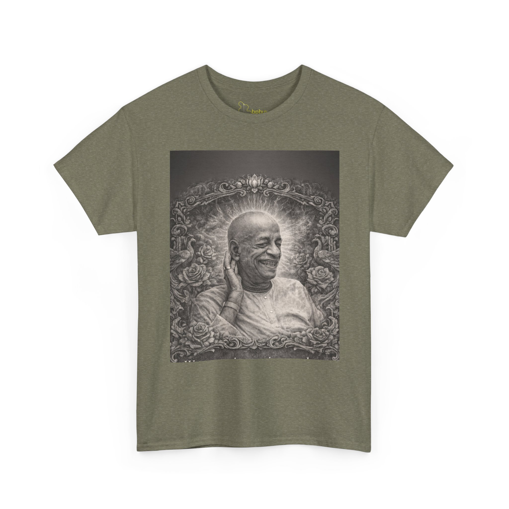 What you wear often reflects what you value. This Prabhupada portrait tee promotes optimism and thoughtful living. It gently reminds others to seek lasting happiness.
