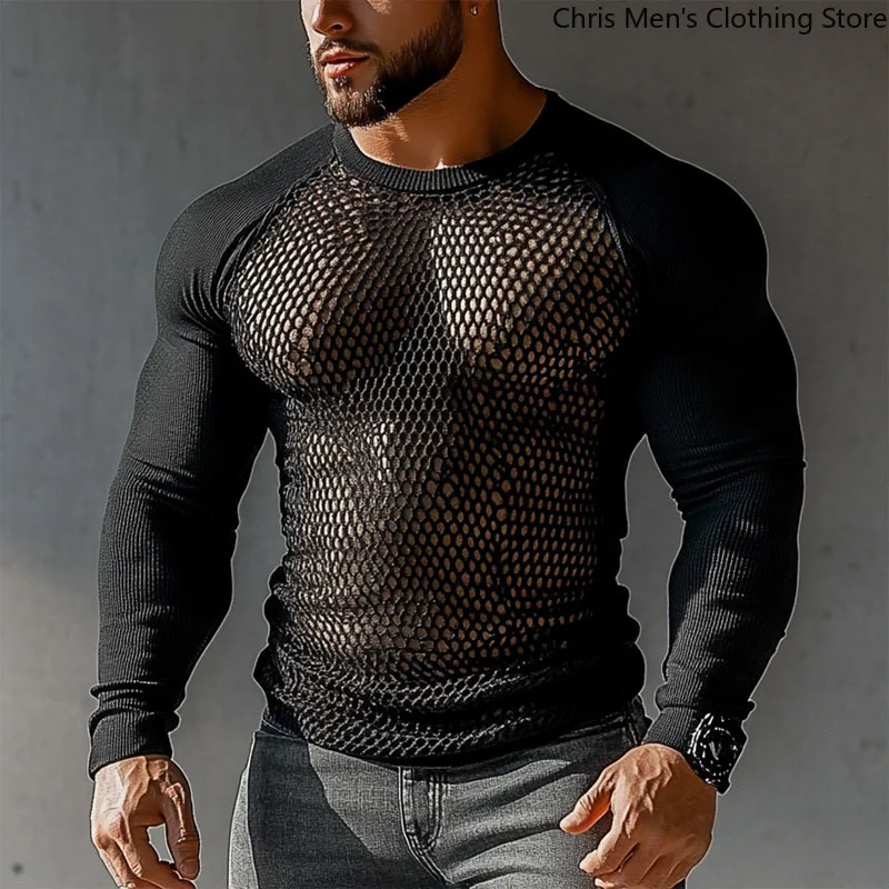 Black Men’s Mesh Long Sleeve T-shirt, Sexy Trend, Suitable for Daily Wear